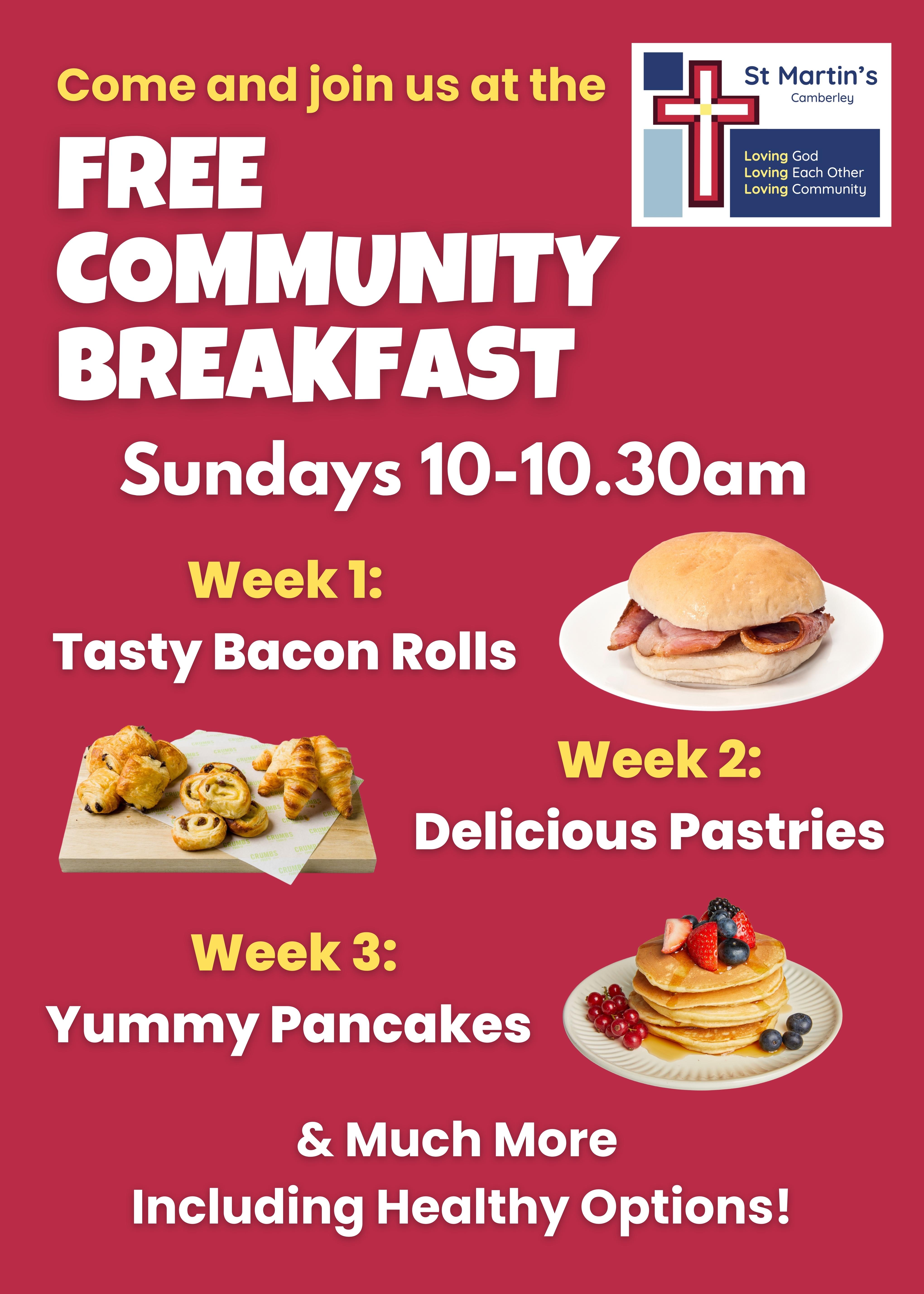Come and join us on Sundays for tasty bacon rolls, delcious pastries, or yummy pancakes at our Free Community Breakfast! You can also enjoy delicious healthy options too. There’s lovely fruit, yoghurts, cereals, toast, great coffee, tea, and fruit juice. Drop in from 10am-10.30am. We’d really love to see you!